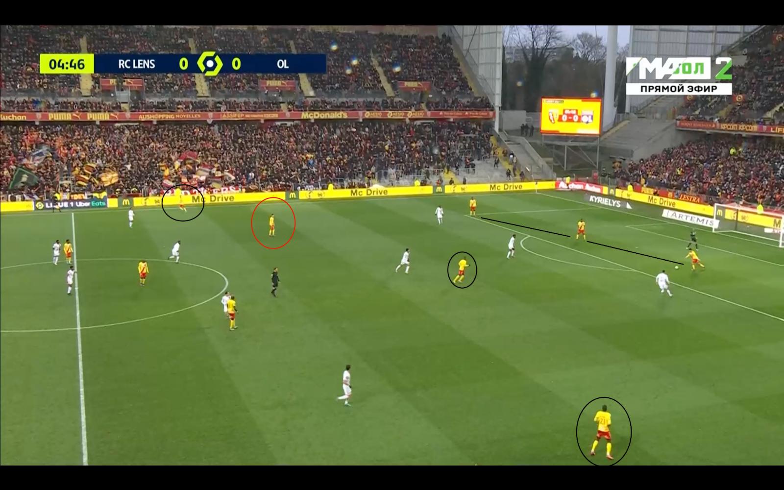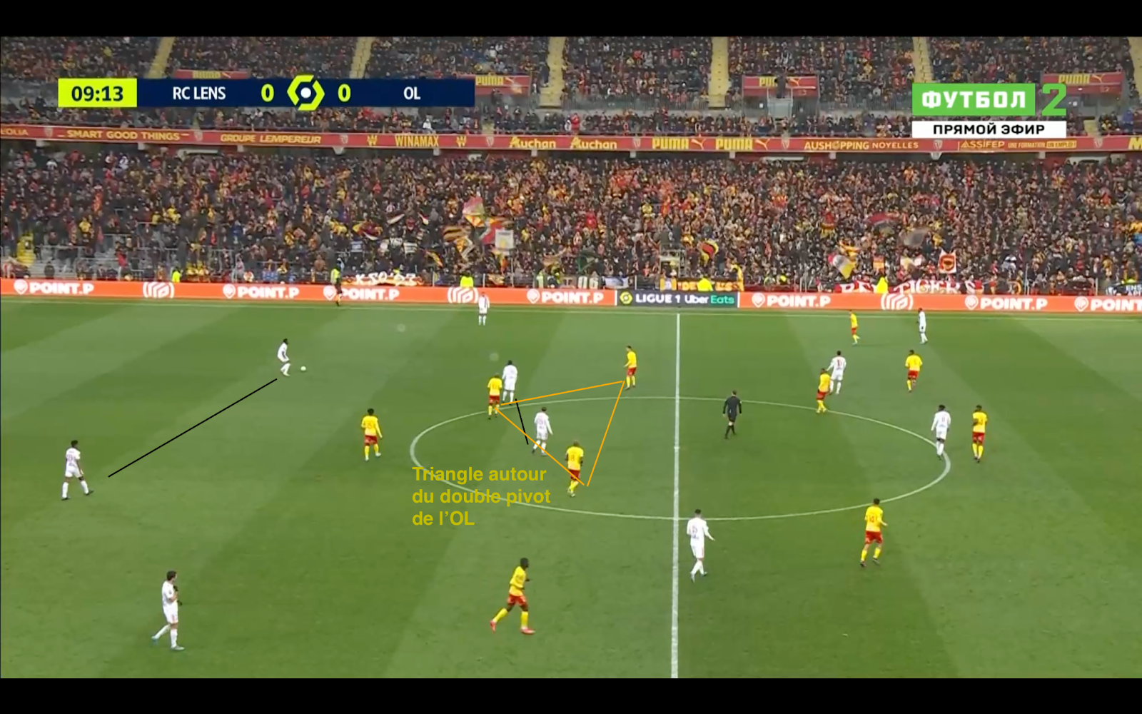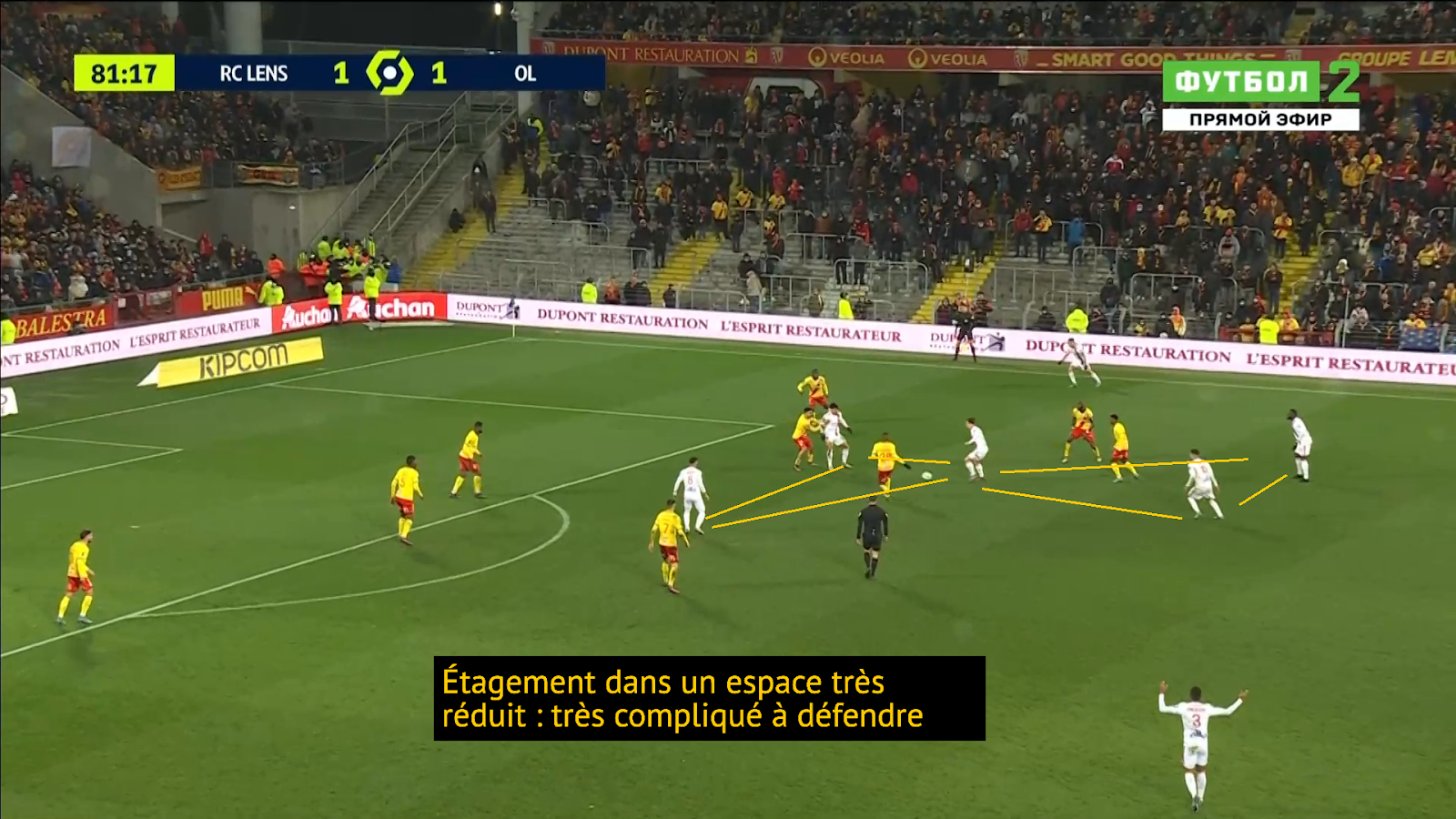 El doble pivote, gracias a su excepcional calidad técnica, supo librarse en ocasiones de situaciones complicadas. De hecho, al trío Sotoca-Kakuta-Fofana le disgustaron los dos centrocampistas del Lyon. Los marcaron individualmente según la altura de su prensa y la ubicación del doble pivote.